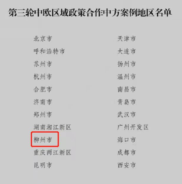 11月,柳州喜报频传!继“柳州经验”被联合国纳入“未来城市”论坛主题报告后,再获好消息!11月12日,国家发展改革委办公厅印发的《第三轮中欧区域政策合作案例地区名单》中柳州赫然在列!与北京、上海、武汉等21个一、二线城市并列在名单中。本次合作期为2021年至2023年,柳州作为广西唯一纳入中欧区域合作中方案例城市地区的城市,将获得三年的机遇期,继续探寻扩大与欧盟各国的互利共赢合作空间,推动柳州对外开放再上一个新台阶。