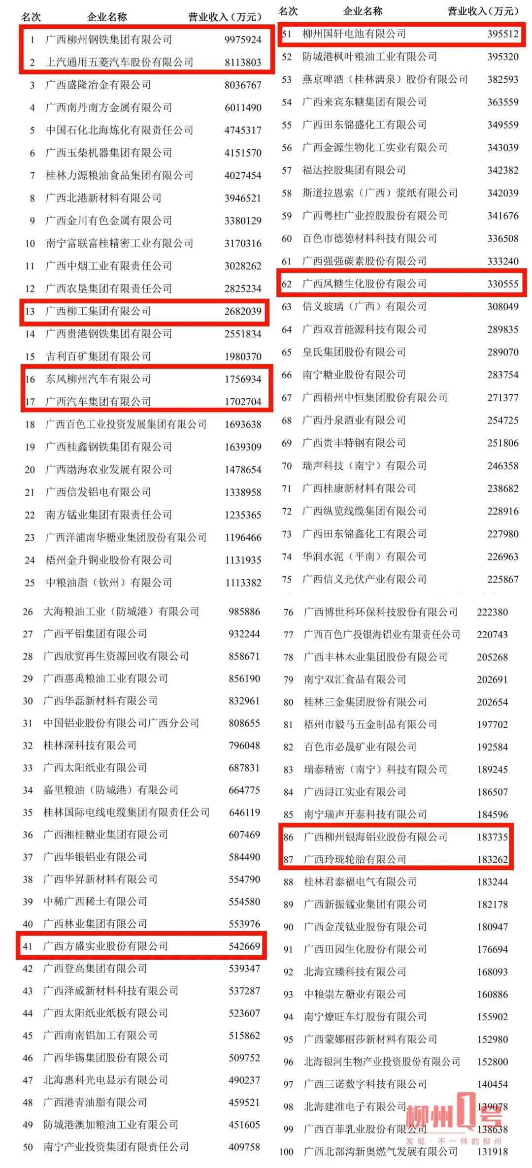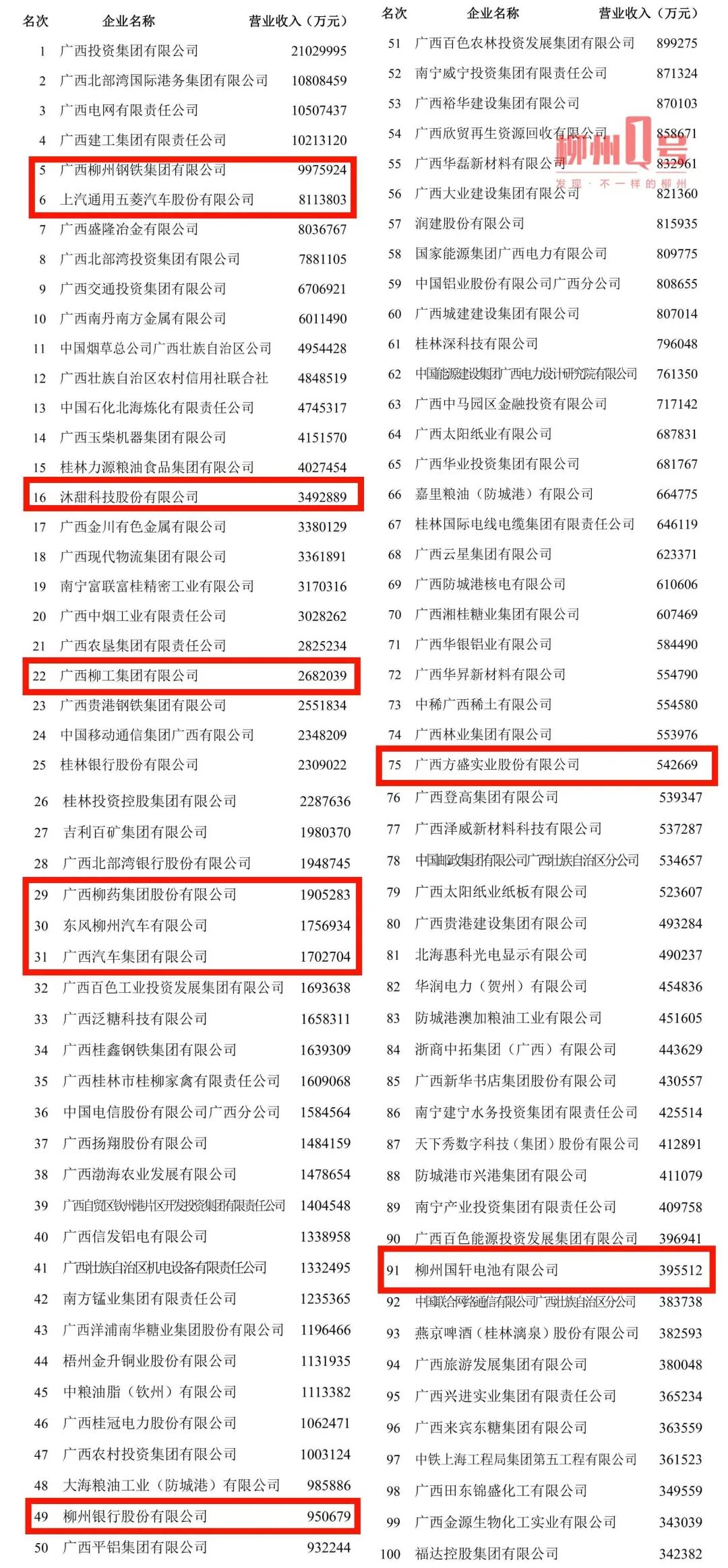 8月3日,广西企业与企业家联合会发布2023广西企业100强、2023广西制造业企业100强、2023广西服务业企业50强榜单,柳州共有23家上榜,涉及汽车及汽车配件、钢铁、机械、制糖、制药、冶金、金融等领域。