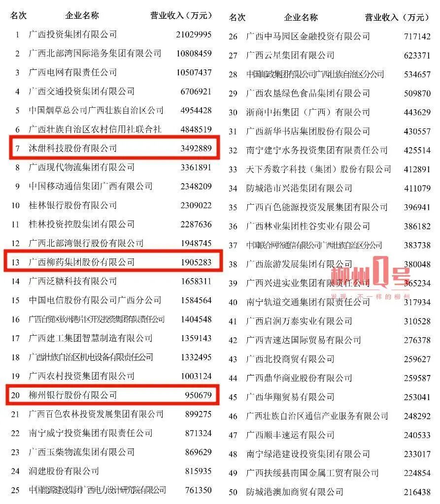 上榜“2023广西服务业企业50强”的柳州企业有3家,分别为:沐甜科技股份有限公司、广西柳药集团股份有限公司、柳州银行股份有限公司。