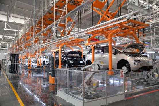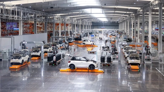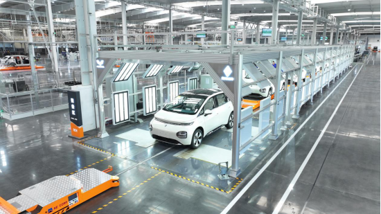 上汽通用五菱生产车间内,新生产的汽车正在通过智能制造生产线。